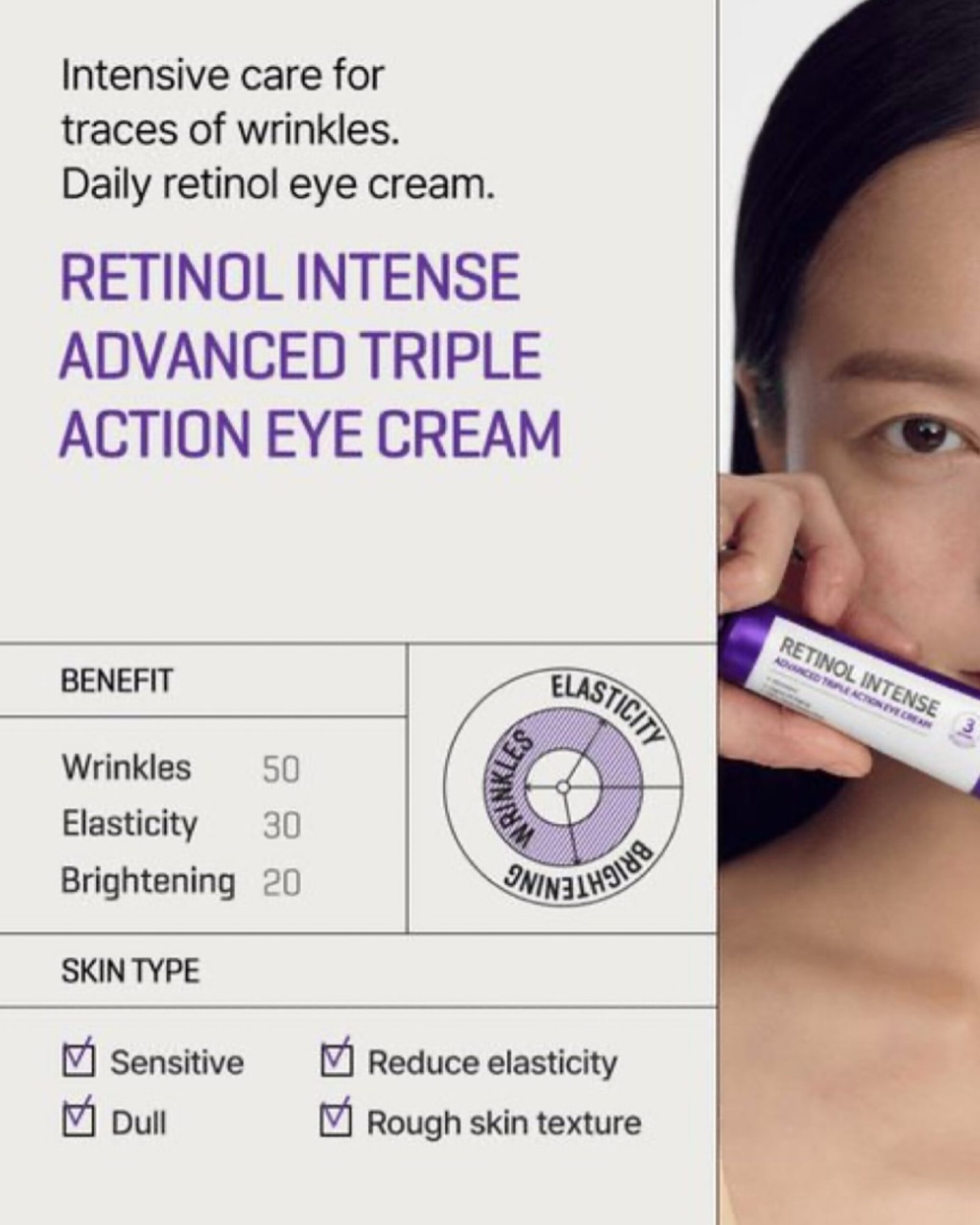 An advanced eye cream designed to target dark circles, fine lines, and loss of firmness around the delicate eye area. The triple-action formula with retinol, retinal, and plant-derived bakuchiol helps smooth wrinkles, support collagen production, and improve skin elasticity.